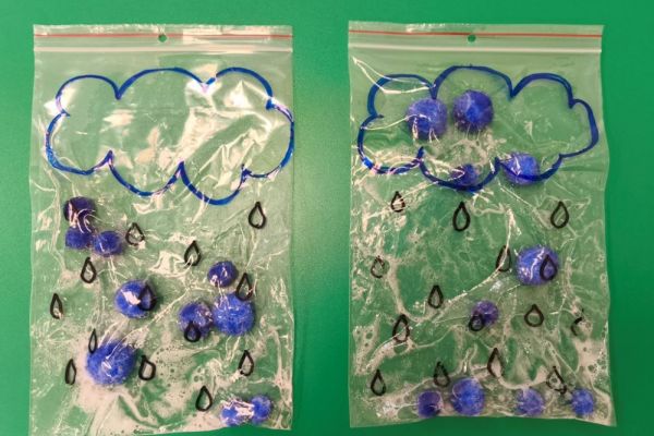 Dnia 05 listopada dzieci z grupy „Pszczółki” uczestniczyły w zajęciach sensorycznych pt: „Kropla deszczu”. Do foliowego woreczka wsypaliśmy niebieskie pompony i dodaliśmy odrobinę mydła. Zadaniem maluszków była próba przesuwania palcem po woreczku tak, aby „pomponik – kropla” trafiła do chmurki. Zabawa dostarczyła maluszkom wiele radości, a przy okazji doskonaliliśmy motorykę małą i koncetrację.