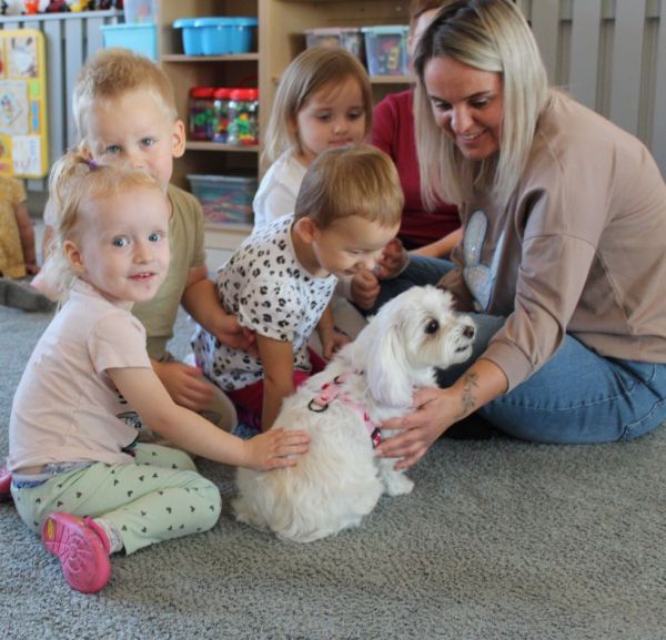 Dnia 3 października 2025r. nasz żłobek odwiedziła Kulka- suczka rasy maltańczyk. Przybyła w towarzystwie swojej opiekunki Amelki. Przywitanie z Kulką to był pierwszy kontakt naszych maluchów z pieskiem. Głaskanie to właśnie forma zaprzyjaźnienia się z czworonogiem. Po krótkiej pogadance na temat, jak należy się zachowywać w obecności psa, rozpoczęły się wspólne zabawy. Spotkanie z wesołym czworonożnym przyjacielem utrwaliło w naszych podopiecznych wiedzę na temat właściwego traktowania zwierząt i sposobów opieki nad nimi.