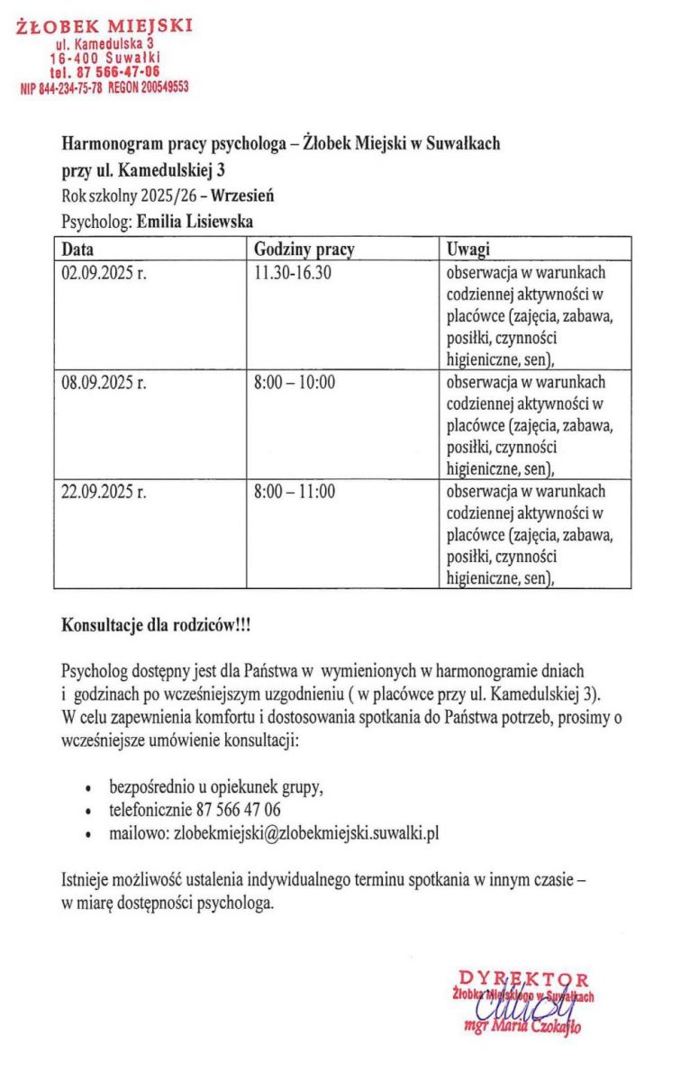 Informujemy, że w żłobku zatrudniony jest psycholog, który prowadzi obserwację rozwoju dzieci oraz udziela porad i konsultacji rodzicom.
